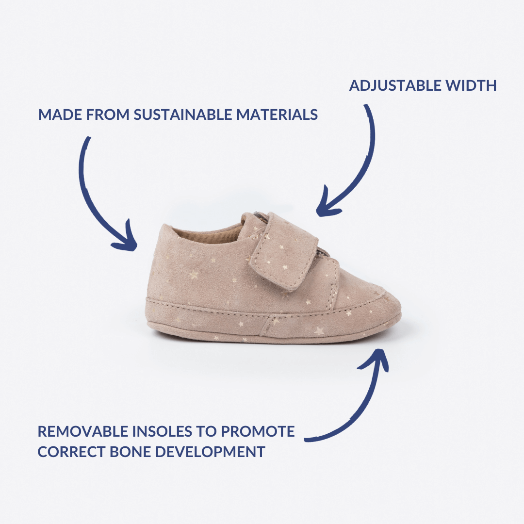 Sparking stars on our booties make these the most sustainable and stylish baby accessories you could wish for. Made from soft goat suede these booties are perfect for keeping growing feet comfortable, padded and warm. With a removable insole, there's plenty of extra room to grow into. Better yet, when your baby does outgrow their pair, send them back to us for recycling and receive £10 off your next order.