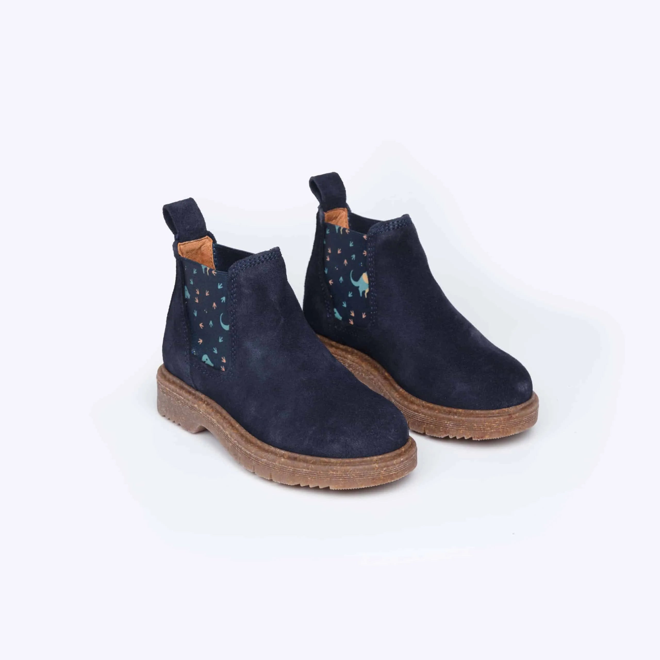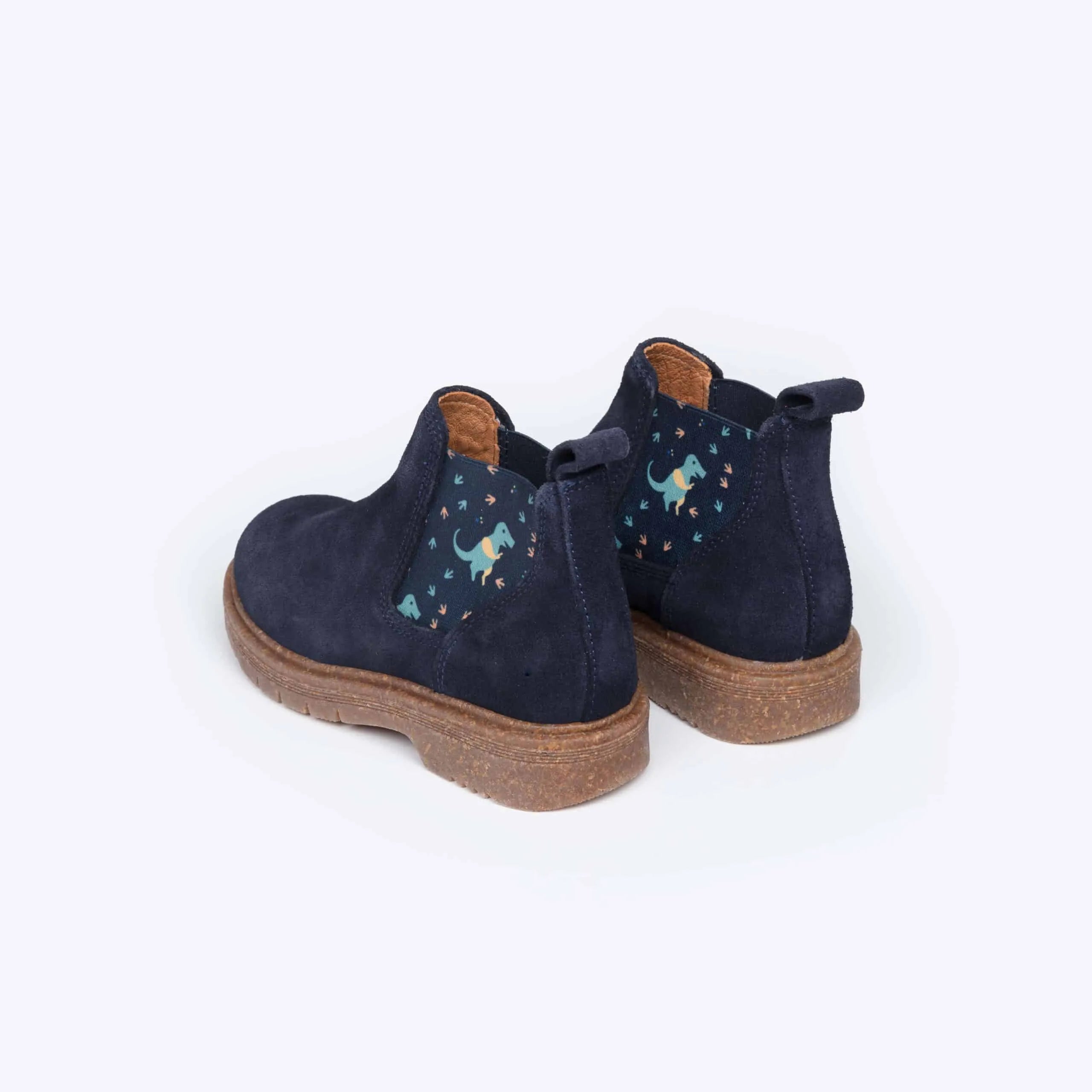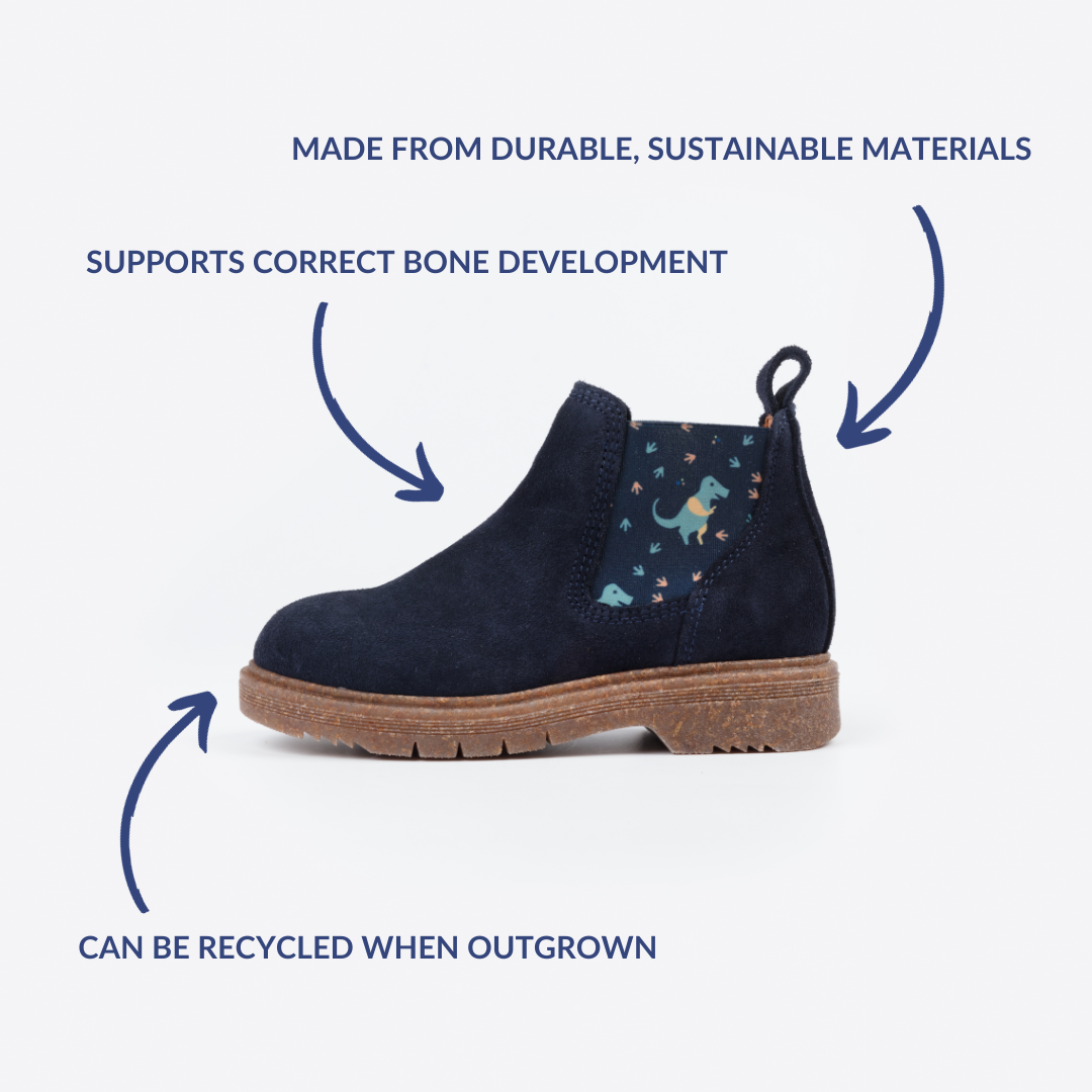 Roar-some Chelsea boots for kids! Our signature dino print Chelsea boots are an all-season favourite. Made from sustainable suedes, and recycled cork, these funky boots are here to keep those little feet warm and dry, whilst being fun and playful.