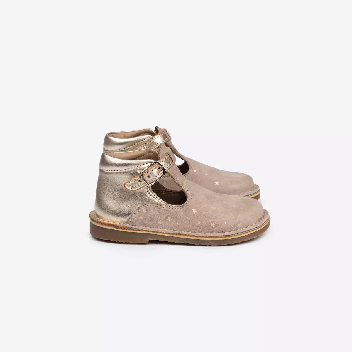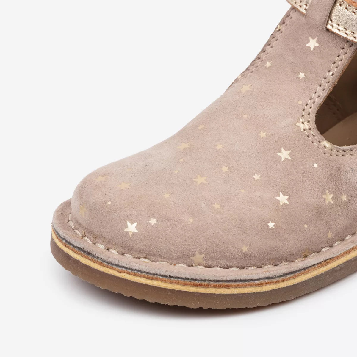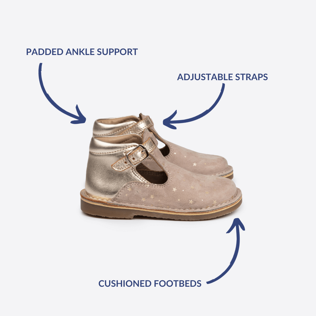 The perfect shoe for a special occasion. Made from sustainable leathers and suedes, these metallic shoes have a unique star design that catches the light when your child walks, providing the perfect amount of twinkle. A popular pair for flower girls, our T-Bars are lightweight, breathable, and easily adjustable with their buckle-up straps. Plus, when the time does come for them to be replaced, we offer a recycling service for retired old shoes