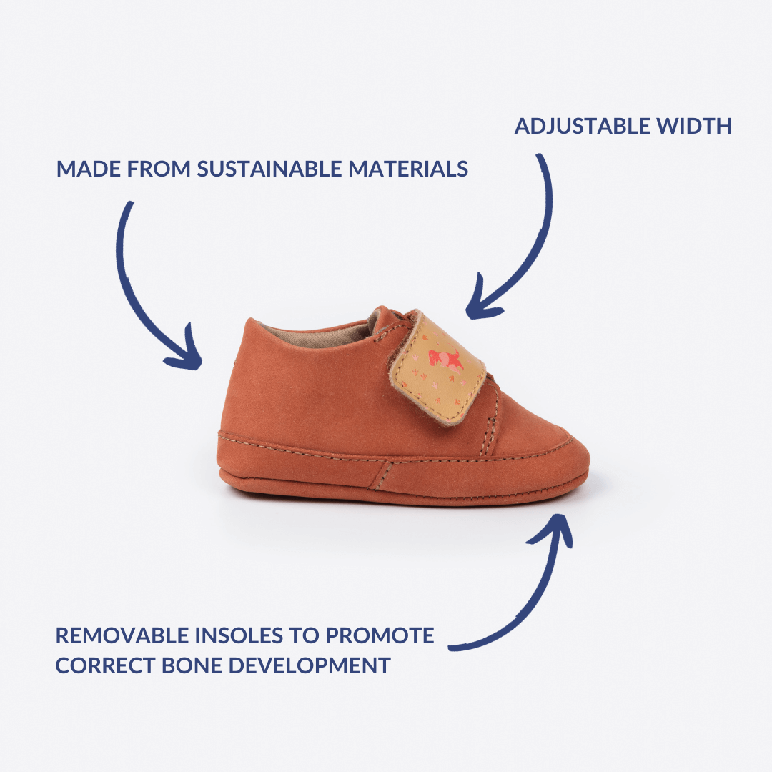 Our Dinosaur Delight booties are made from soft cow nubuck perfect for keeping growing feet comfortable, padded and warm. The cow nubuck is rescued from off-cuts from our factory that have been wasted by other brands ensuring we are contributing to reducing waste, a big part of the sustainability issues caused by the fashion industry. With a removable insole, there's plenty of extra room to grow into. Better yet, when your baby does outgrow their pair, send them back to us for recycling and receive £10 off your next order.