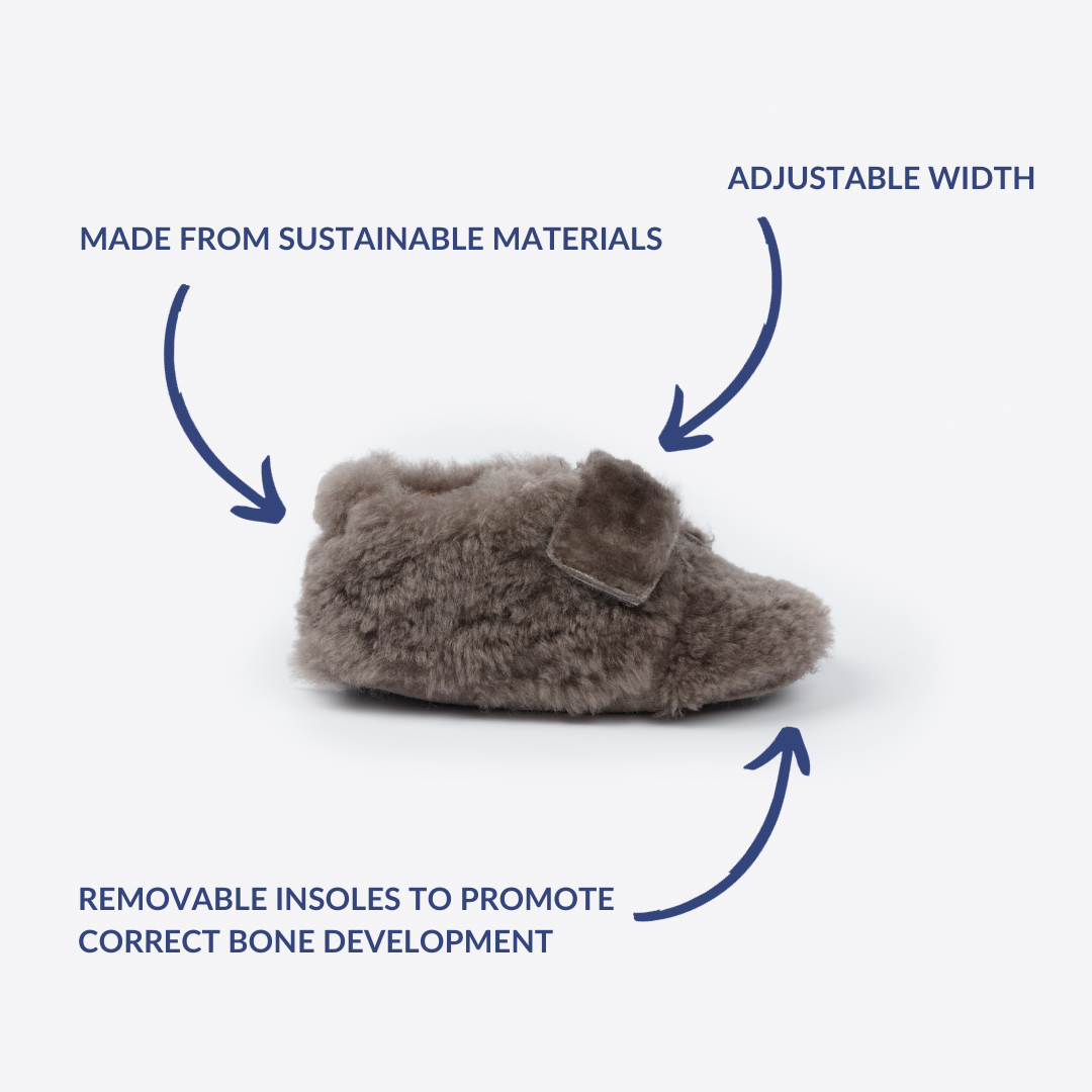 Our Furry Friend booties are made of super soft sheep fur and a metallic goats suede sole, all from factory off-cuts that have been wasted by other brands. These booties are comfortable and warm whilst making your little ones’ feet look simply adorable. With a removable insole, there's plenty of extra room to grow into. Better yet, when your baby does outgrow their pair, send them back to us for recycling and receive £10 off your next order.